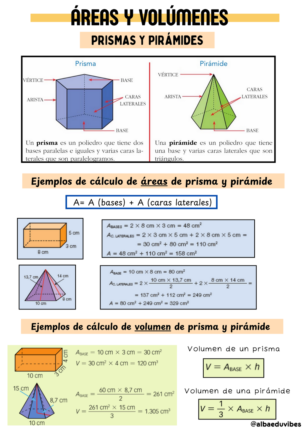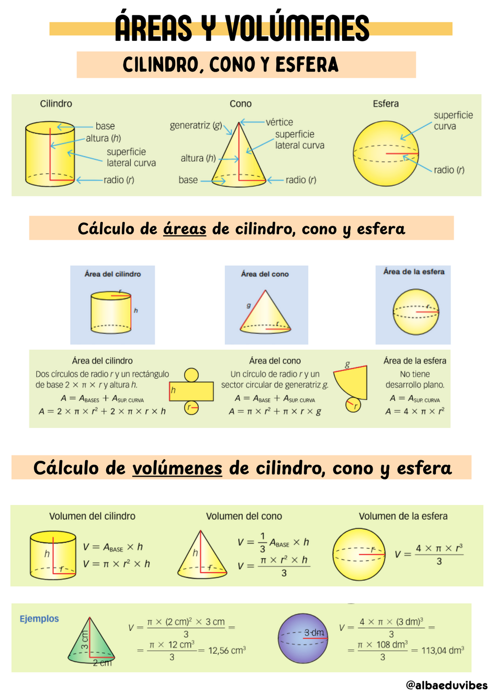 Incluye fórmulas de áreas y volúmenes de: